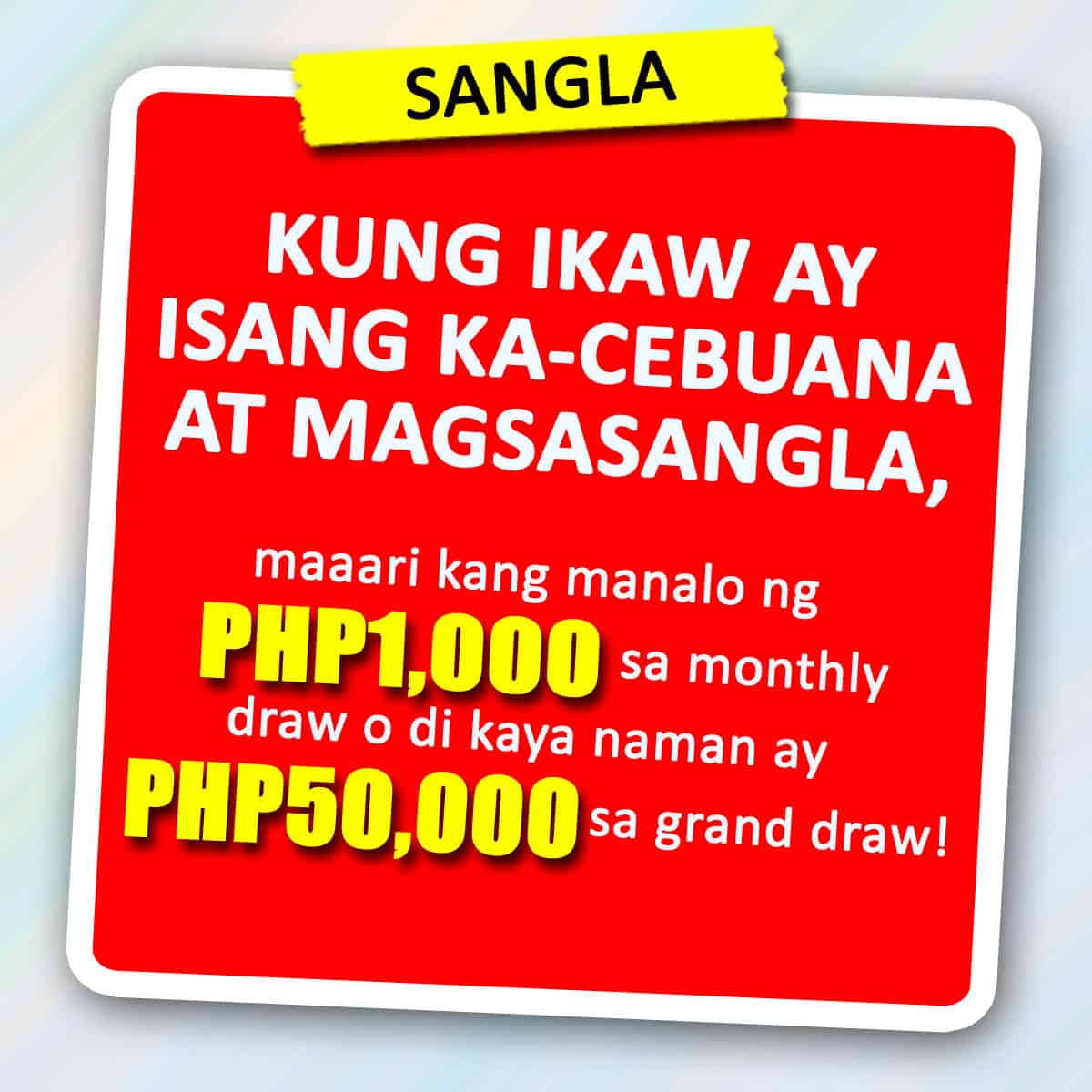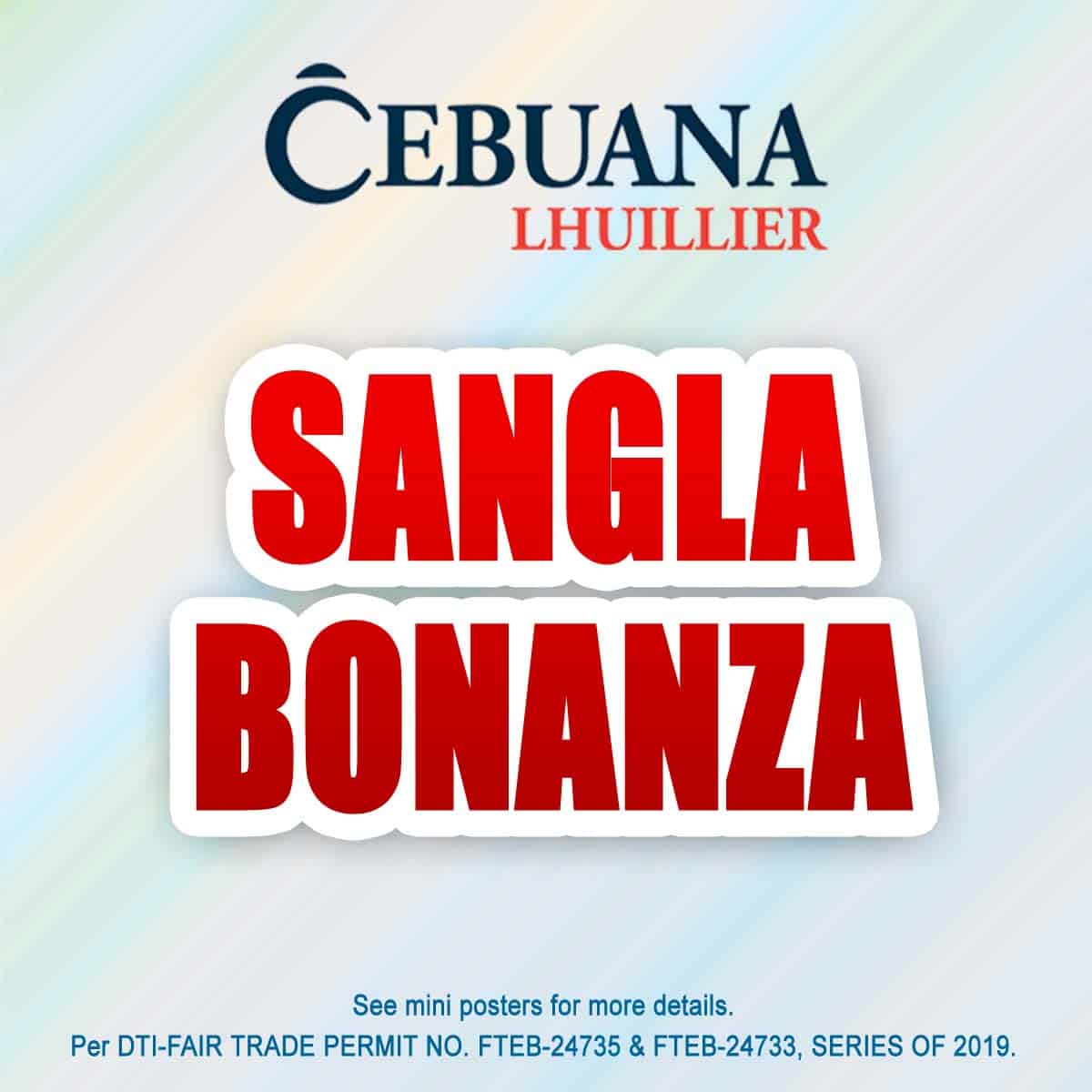 Hindi lang mataas ang appraisal, may chance ka pang mag-uwi ng up to PhP50,000 sa grand draw o di naman kaya ay instant prize kung ikaw ang first time pawning client! Magsangla lang sa kahit saang Cebuana Lhuillier branch nationwide. See posters for more details. Per DTI-FAIR TRADE PERMIT NO. FTEB-24733 & FTEB-24735, SERIES OF 2019.