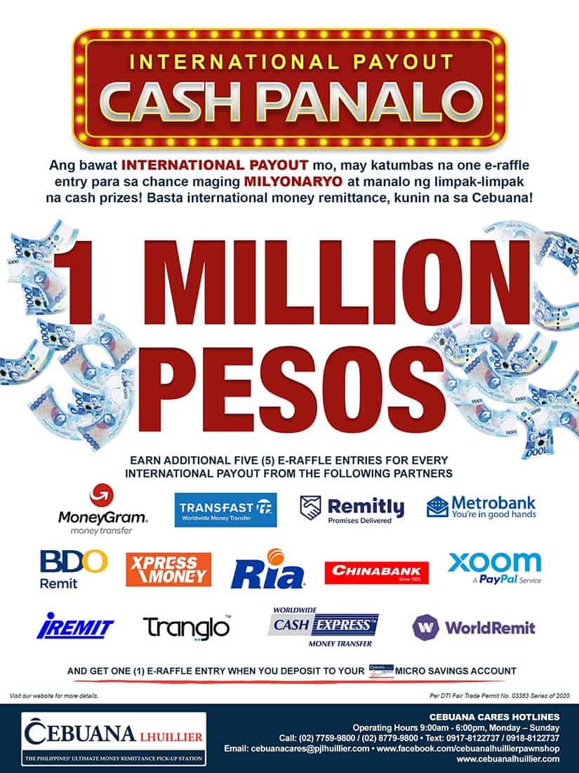Promo Mechanics This promo is open to all clients who will claim their international remittance sent thru participating partners abroad in any of Cebuana Lhuillier’s 2,500 branches. Clients will