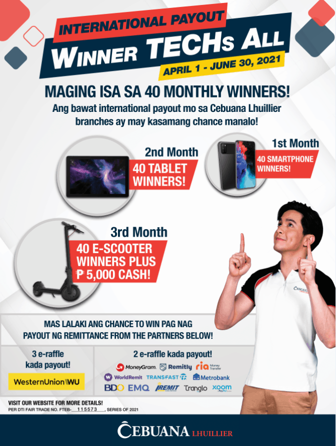 - Promo will run from April 1 – June 30, 2021. Customers who payout international remittance at any Cebuana Lhuillier (CLH) branch will automatically gain one (1) e-raffle ticket and a physical raffle stub. International remittance payout from one of the top partners below will grant two (2) e-raffle tickets and physical stubs, while international payout from Western Union will grant three (3) e-raffle tickets and physical stubs.