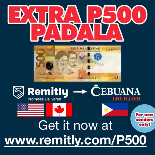 - Sabihan ang mga kaanak sa USA & Canada na mag-Pera Padala ng $100 or more thru Remitly—may extra P500 dagdag para sayo at $40 bonus para sa kanila!