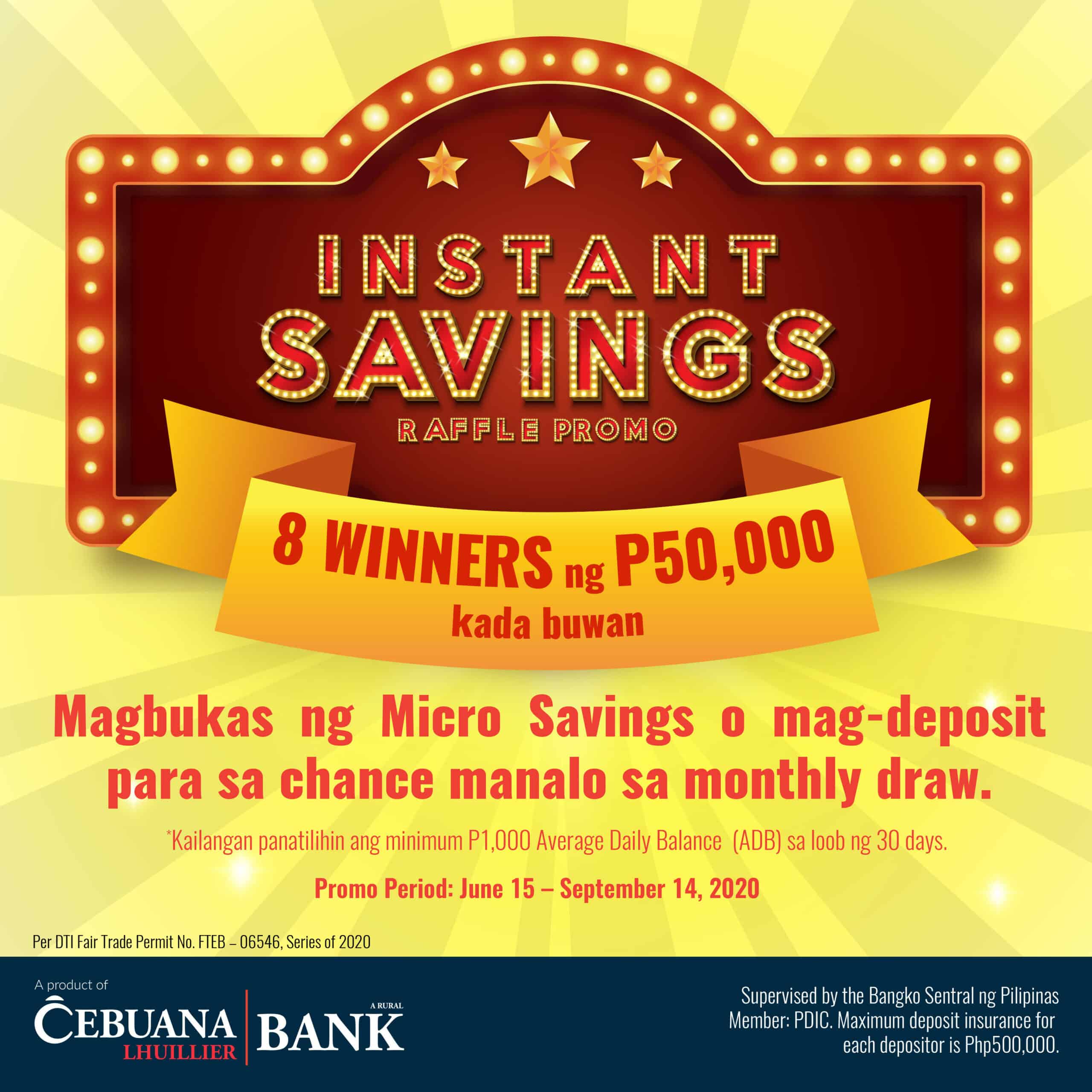 - Ang prize ay ide-deposit sa Micro Savings account ng winning client. Ang prize na sobra sa Micro Savings maximum amount limit na P50,000 ay maaaring ibigay ng cash o piliin ng client na mag-upgrade at magdeposit sa Cebuana Savings.