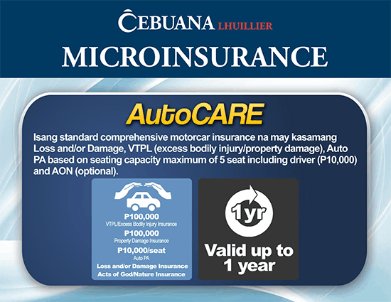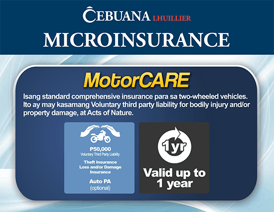 Cebuana Lhuillier’s Microinsurance help Filipinos avail of financial services that promise to minimize the impact of distress and misfortune should a disaster or unfavorable event occur. Cebuana Lhuillier offers more than 20 unique and tailor-fit insurance products for you! Other Insurance products includes vehicle insurance and property insurance.