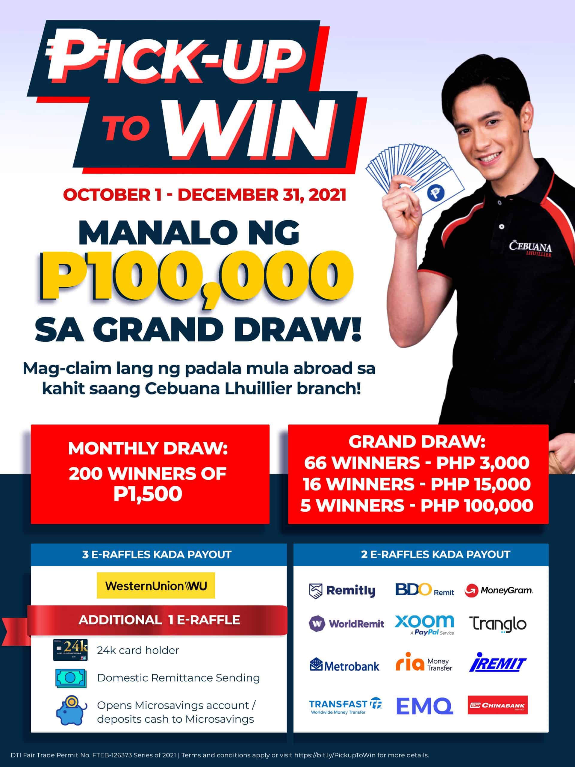 - This electronic raffle promo is open to all clients who will claim their international remittance sent through partners abroad in any of Cebuana Lhuillier’s 2,500+ branches nationwide.