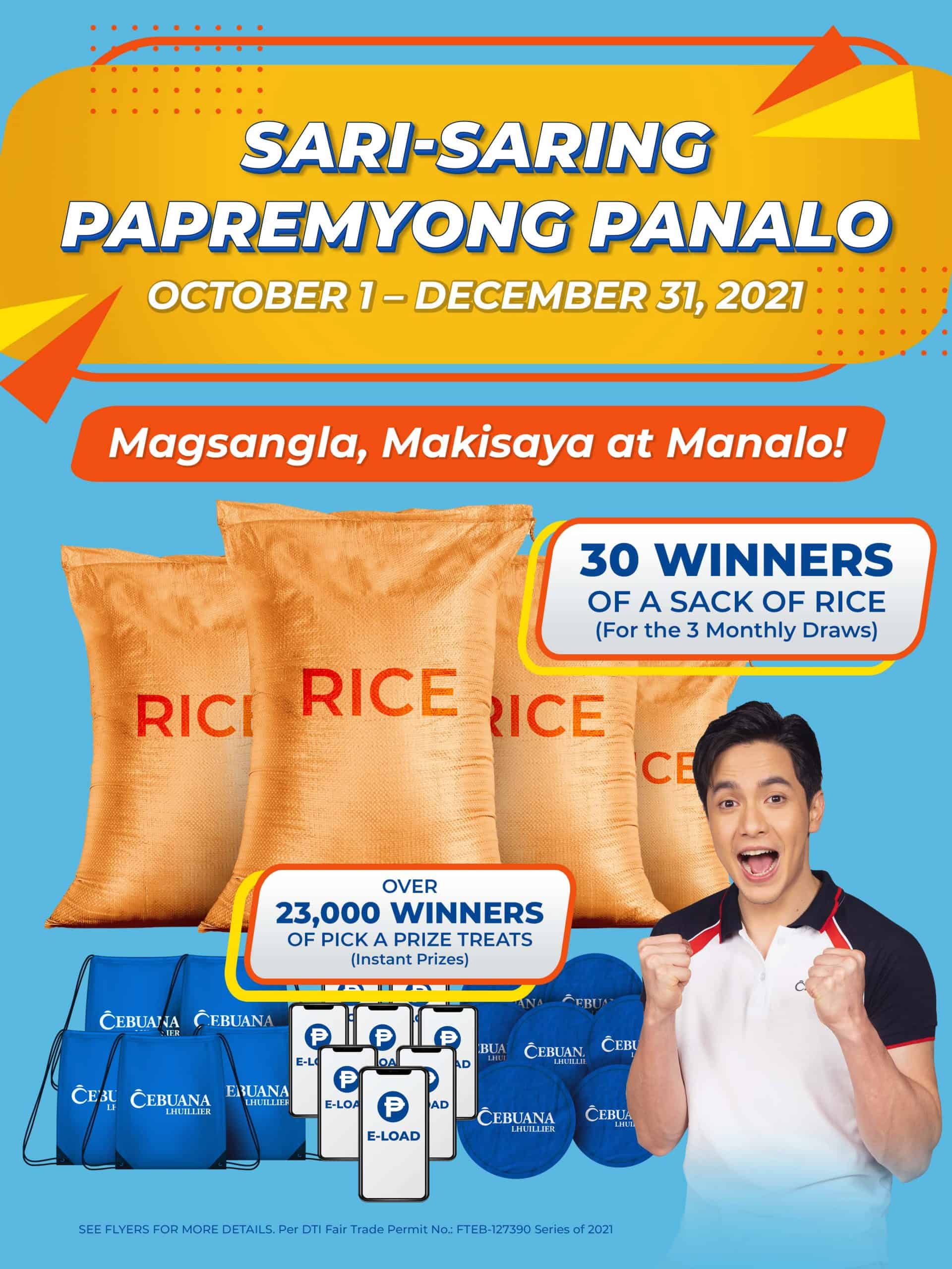 - Cut off of entries on the 1st monthly draw is on October 31, 2021 at Cebuana Lhuillier branch closing. Non-winning raffle entries on the 1st monthly draw plus raffle entries received from November 1 up to November 30, 2021 at Cebuana branch closing will be included in the 2nd Monthly Draw. Non-winning raffle entries from the 2nd draw plus raffle entries received from December 1 -31, 2021 at Cebuana branch closing will be drawn in the 3rd Monthly draw.