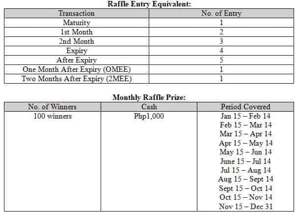 -Each client who will have any of the following will earn one (1) e-raffle entry depending on the transactions availed.
